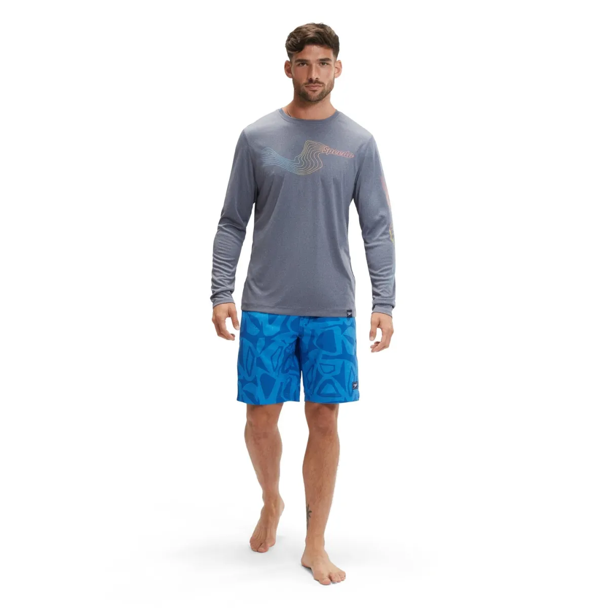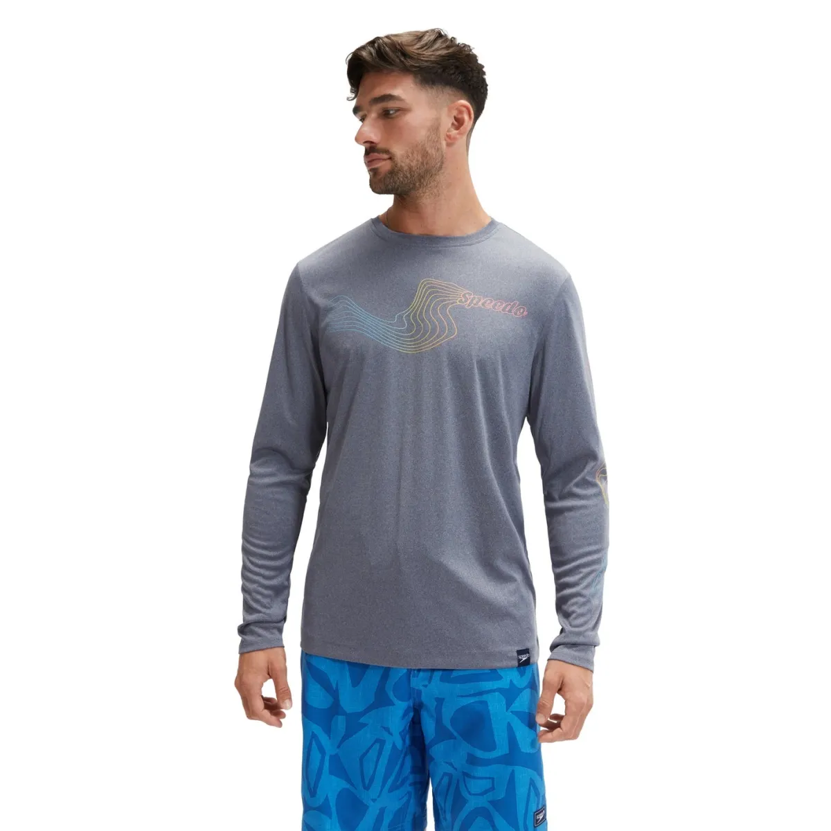 Stay protected from the sun whatever the weather wearing our navy Long Sleeve Swim Tee, featuring a Speedo logo and multicoloured line graphic. Comfortable wet and dry, the relaxed-fit, pull-on style offers UPF40 fabric sun protection, so you’re covered both in and out of the water. Taking you from beach to pool, our EnduraBrite fabric offers higher chlorine resistance than standard swimwear fabrics, delivers superb colour performance and fits like new for longer with CREORA® HighClo™. Made in part from recycled plastic bottles – the polyester yarn in the fabric is made from 100% post-consumer waste.