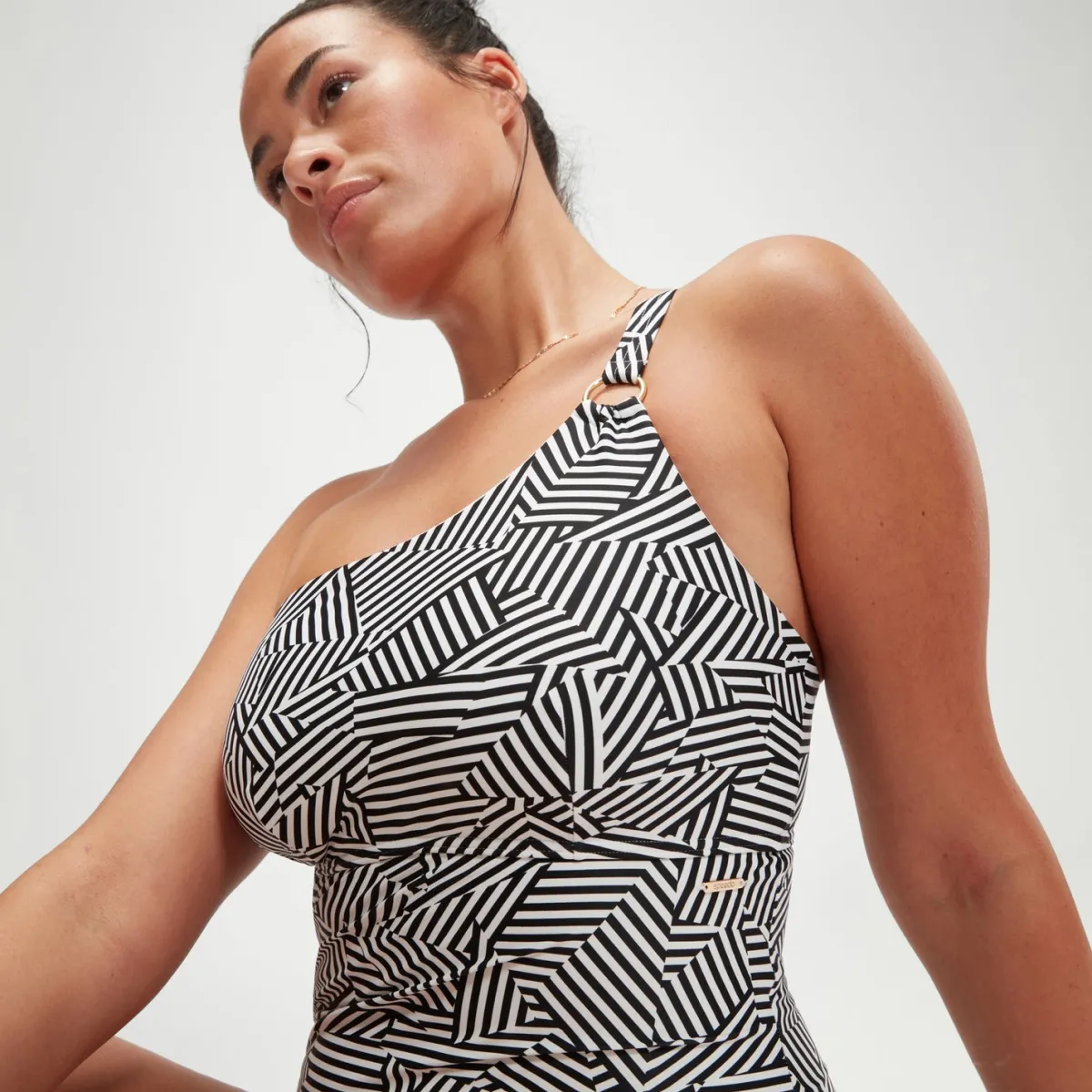 Oozing poolside glamour, this monochrome-print Asymmetric Shaping swimsuit features a sophisticated one-shoulder neckline and a stunning laced back for a customised fit. The chic design is finished with an embossed gold ring at the adjustable strap and includes removable bra pads for support and shaping. Cut from our premium, comfortable body-shaping fabric, which works with the patterned print to smooth and contour the body, it’s ideal for the beach or pool. offering higher chlorine resistance than standard swimwear fabrics, our new shaping fabric fits like new for longer with CREORA® HighClo® . The Nylon yarn in our new shaping fabric is also made from 100% pre-consumer waste, such as waste fabric from factories.